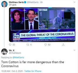 科頓2月2日接受美國保守派媒體福克斯新聞網的採訪 作為一貫的反華頑固派,科頓瞄準了這次疫情的“好時機”,通過荒謬的造謠言論大肆抨擊中國。他在推特以及媒體採訪中多次聲稱新冠病毒是武漢實驗室泄露的生化武器。科頓夾雜私人政治觀點並毫無根據的指責引發了業界學者的不滿。英美許多媒體都進行了批駁,美國《赫芬頓郵報》提醒讀者,別聽科頓胡扯;《華盛頓郵報》在1月29日發文否認了這一聳人聽聞的“觀點”,還向幾位生物領域的專家求證了真偽;英國《衞報》也站出來闢謠。中國駐美大使崔天凱9日在接受美國CBS採訪時稱,對這種謠言進行了批駁。在一片罵聲中,科頓10日在個人推特發文直接@崔天凱大使,仍在為自己的陰謀論辯護。
