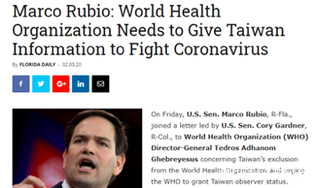 由美國共和黨參議員加德納(Cory Gardner)牽頭,參議員魯比奧(Marco Rubio)、科寧(John)、克魯茲(Ted Cruz)、科頓(Tom Cotton)、英霍夫(Jim Inhofe)和羅姆尼(Mitt Romney)等日前聯名致信世衞組織,藉口新冠病毒疫情,敦促世衞組織允許台灣參與相關議題,併成為觀察員。在信中,這些人還污衊稱中國信息明顯不可靠,依靠其來接收世衞組織的信息,對台灣地區人民來説是不可接受的健康危害。