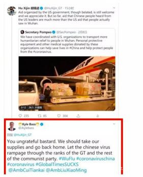 胡錫進推特截圖 “你這個不知感恩的混蛋,我們應該拿回所有的物資帶回家。讓中國病毒橫掃GT(環球時報)員工和共產黨的其他人。”這句惡毒的詛咒出自美國知名投資人凱爾·巴斯之口。緣起是環球時報總編輯胡錫進8日在推特個人賬號上點評了美國國務卿蓬佩奧的一條推文。蓬佩奧的推文説,“我們與美國的組織進行了協調,以向武漢人民運送更多的人道主義救濟。”因為美國政府到8日晚上為止在各國中撤得最快,而援助又説得多做得少。胡錫進在點評中提到:“美國政府組織的援助即使遲到了,但還是值得歡迎的,也應該予以感謝。只是迄今為止,中國人民從美國領導人講話中聽到的援助比武漢人民實際看到的美國援助要多得多”。這一客觀的點評遭到了巴斯的惡毒攻擊,他在留言中竟然口出上述詛咒之語,雖然他後來在抗議下刪掉了這個詛咒留言,但仍拒絕道歉。