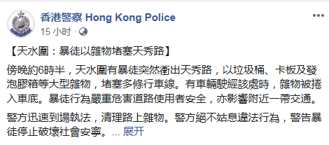 昨日19時07分,香港警方曾在臉書發文表示,暴徒的行為嚴重危害道路使用者安全,亦影響附近一帶交通。警方迅速到場執法,清理路上雜物。警方絕不姑息違法行為,並警告暴徒停止破壞社會安寧。