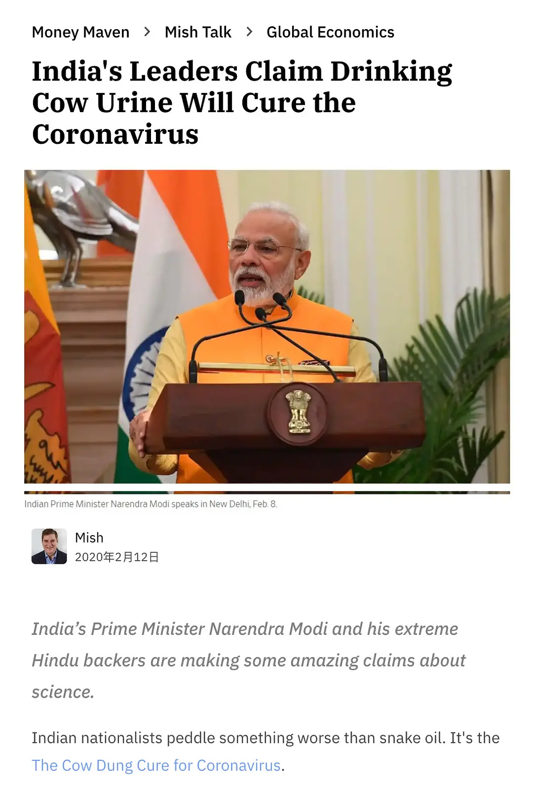 據《印度時報》報道,據印度媒體報道,近年來崛起的政客、印度教極端主義政黨印度教大齋會(Akhil Bharatiya Hindu Mahasabha)的主席斯瓦米·查克拉帕尼(Swami Chakrapani)宣稱,“食用牛尿和牛糞可以阻止傳染性冠狀病毒的。”他還稱,用牛尿、牛糞塗抹在患者全身,高唱梵文聖歌“唵南啊濕婆耶”,就能得救。