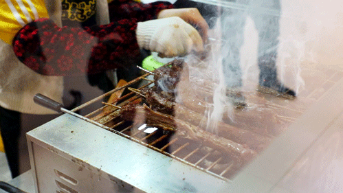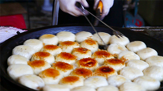 武漢的路邊,都會有人推着大車賣米粑粑。因為是成對出賣,因此叫“對粑”,而小孩則叫它“粑粑”。它是武漢很傳統的早點,看造型更像是沒有夾心的銅鑼燒。