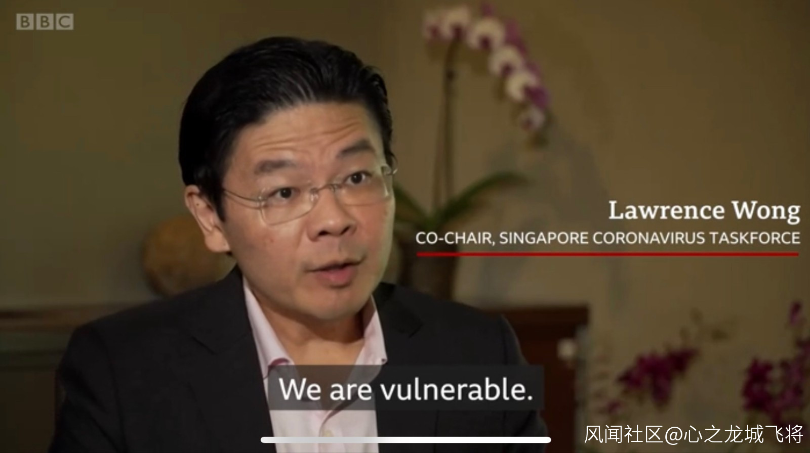 新加坡國家發展部部長黃循財在2月12日接受BBC採訪時表示,“我們很脆弱,所以我們必須要盡一切努力遏制病毒的傳播。”(圖源:BBC視頻截圖)
