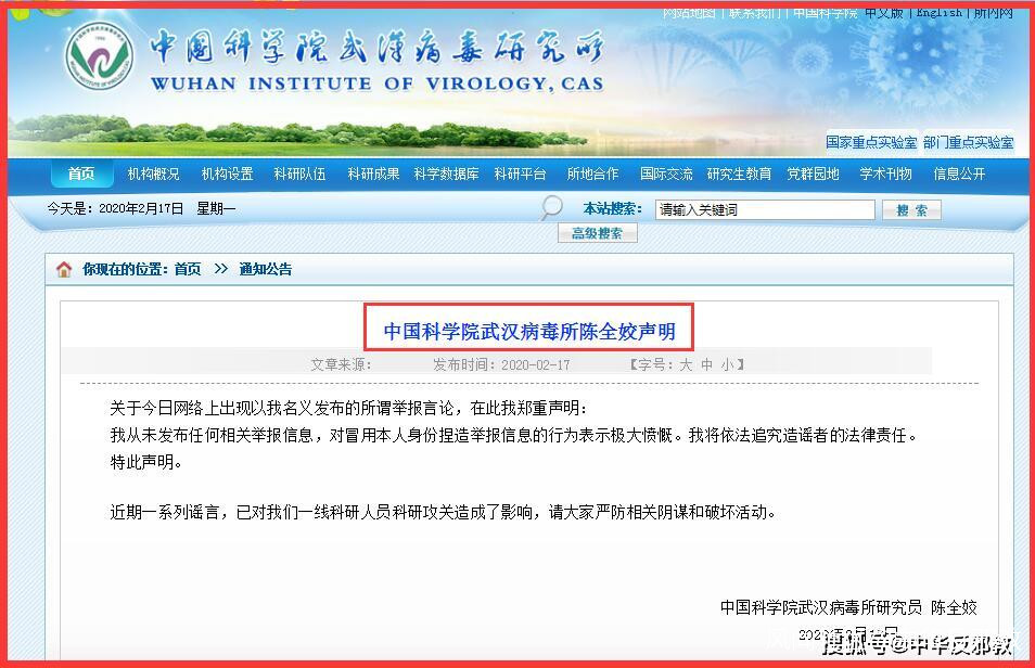 繼闢謠畢業生黃燕玲是所謂“零號病人”之後,中科院武漢病毒所官網再登聲明稱,陳全姣研究員從未發佈任何舉報信息。