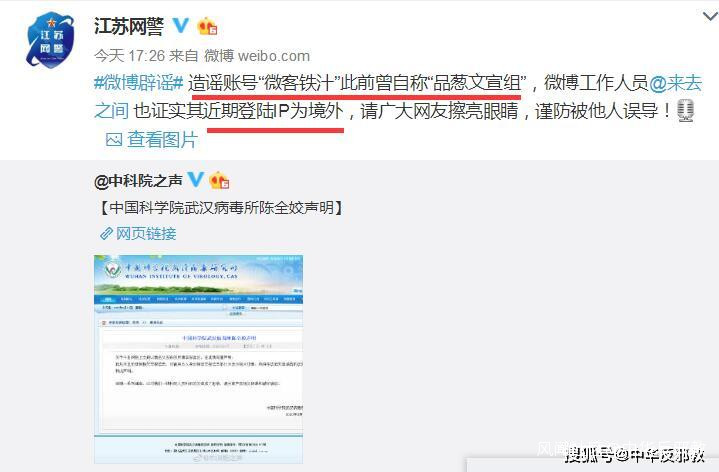 長安街知事(微信ID:Capitalnews)注意到,上述聲明發表後,江蘇網警也發佈消息稱,造謠賬號“微客鐵汁”此前曾自稱“品葱文宣組”,微博工作人員已證實其近期登陸IP為境外,請廣大網友擦亮眼睛,謹防被他人誤導!