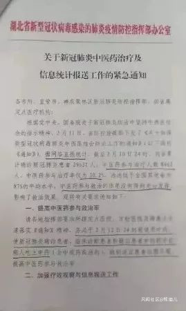 這些因素都不無道理,但還有一個因素不能忽視。那就是湖北省比較全國其他地區,在新冠病毒肺炎的治療方案上存在着一個明顯差異:根據湖北疫情防控指揮部流傳到網上的一份文件,湖北新冠肺炎患者中醫藥使用比例只有30.2%,遠低於全國87%的水平。