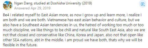 在之前我更多地把自己和東亞聯繫在一起,隨着我的成長和學習,我意識到我們兩者(東亞人和東南亞人)都是。越南人有東亞的行為和文化,但我們也有東南亞的性格,比如對工作太多或太多紀律的憎恨,我們像東南亞一樣喜歡冰冷和自然的東西,我們不像中國、韓國和日本那樣封閉保守,也不像其他海洋國家那樣開放,我們介乎於兩者之間。我為我們兩個都有感到驕傲,這就是為什麼我們將來會變得更靈活。