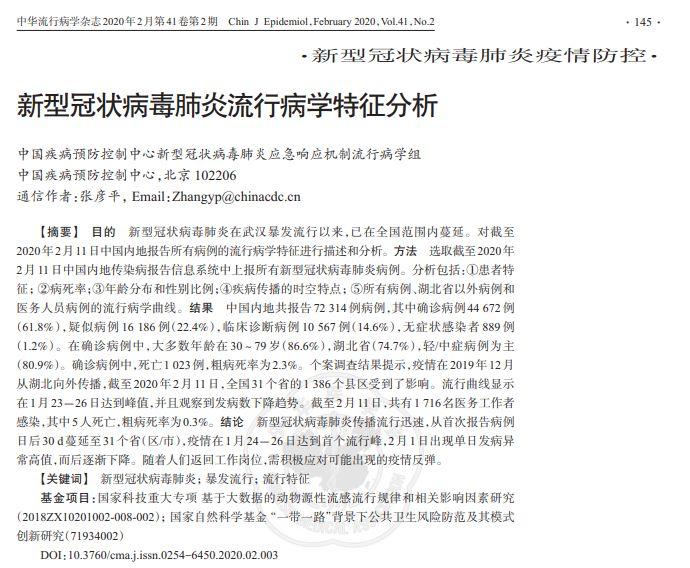 近日,中國國內的醫學學術期刊《中華流行病學雜誌》,預出版了一篇來自中國疾病預防控制中心“新型冠狀病毒肺炎應急響應機制流行病學組”的論文。