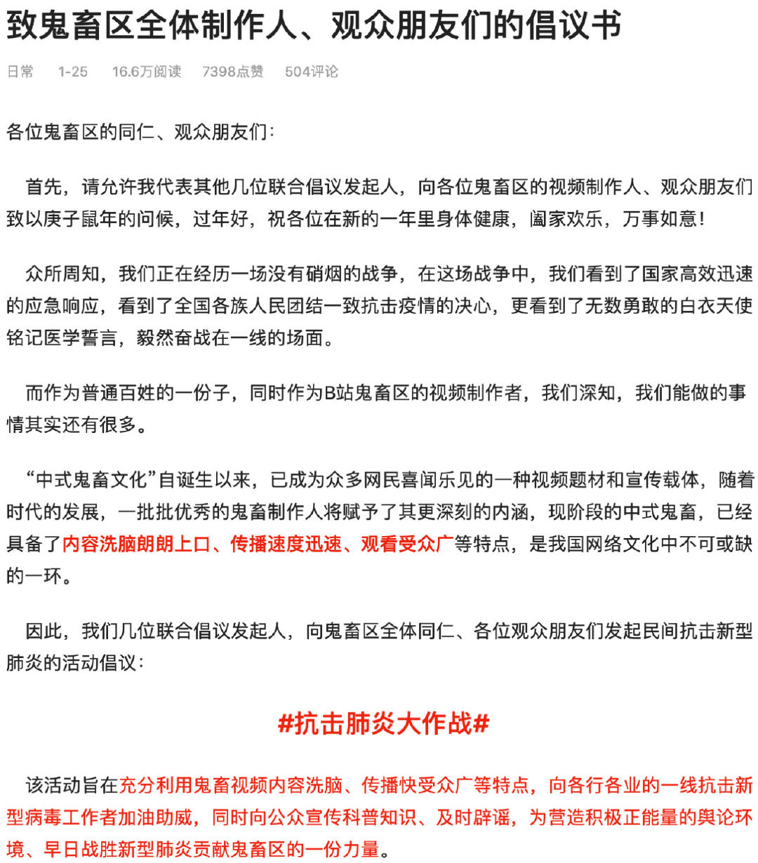 1月25日,“Z傑洛X”、“還有一天就放假了”、“潮汕好男人”等6位知名鬼畜區UP主,聯合在B站發表了一篇名為《致鬼畜區全體制作人、觀眾朋友們的倡議書》的文章,希望活躍在B站鬼畜區的眾多創作者們,能夠製作一些積極正能量的“中式”鬼畜視頻,為早日戰勝新型肺炎貢獻鬼畜區的一份力量。