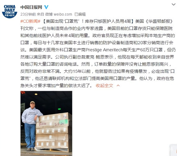 43人蔘與24評論美國《華盛頓郵報》刊文稱,一位與製造商合作的業內專家透露,美國目前的口罩存貨只能保障醫院和其他前線醫護人員未來4周的用量。政府官員現正在考慮增加採購本地生產商的口罩,每日與十幾家在美國本土進行銷售的防護設備製造商和20家分銷商進行會談。美國最大醫用外科口罩生產商Prestige Ameritech每天生產60萬隻口罩,但仍然難以滿足需求。公司執行副總裁麥克·鮑恩表示,他現在每天都能收到來自世界各地訂購大量口罩的諮詢電話。然而,訂單數量的保障並沒有讓鮑恩感到高興,反而對政府非常不滿。大約15年以前,他就警告過如果有疫情暴發,必定出現“口罩荒”,他還懇請聯邦機構和立法部門提高美國用口罩的產量。他認為,政府在危急關頭才要求增加產量的做法太遲了。