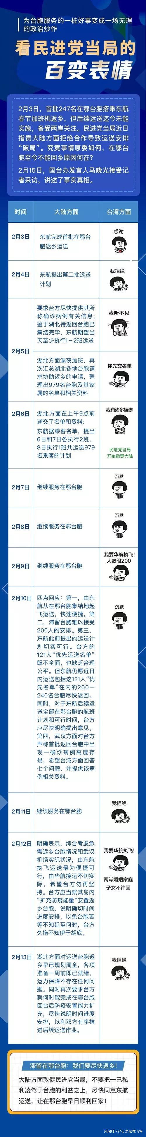 事實是:在2月3日首批迴鄉的247名台胞中,已優先運送老人、少年兒童和慢性病患者98人。而且,儘快運送就是最大優先,也最符合每一位需要儘快返鄉的台胞的利益。但直到9日,台灣方面才提出121人的“優先名單”,早就耽誤了東航之前的執飛安排,這樣的“優先”,真是令人哭笑不得!