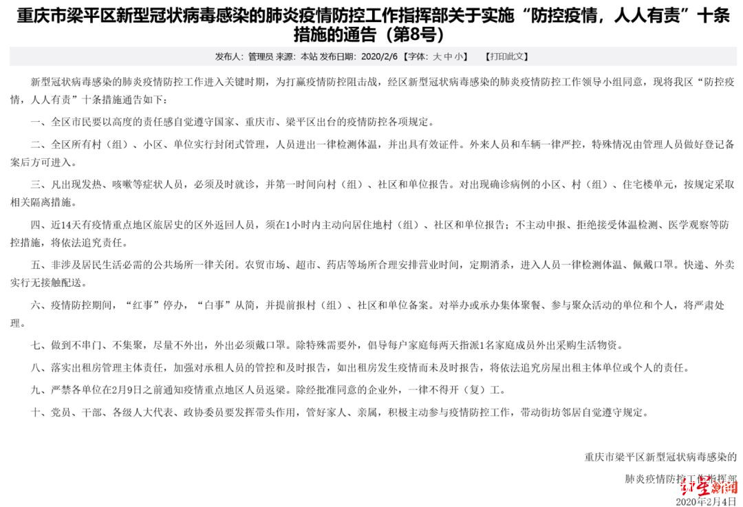 紅星新聞記者注意到,2月4日,重慶市梁平區新型冠狀病毒感染的肺炎疫情防控工作指揮部發布關於實施“防控疫情,人人有責”十條措施的通告。