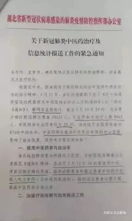 這些因素都不無道理,但還有一個因素不能忽視。那就是湖北省比較全國其他地區,在新冠病毒肺炎的治療方案上存在着一個明顯差異:根據湖北疫情防控指揮部流傳到網上的一份文件,湖北新冠肺炎患者中醫藥使用比例只有30.2%,遠低於全國87%的水平。