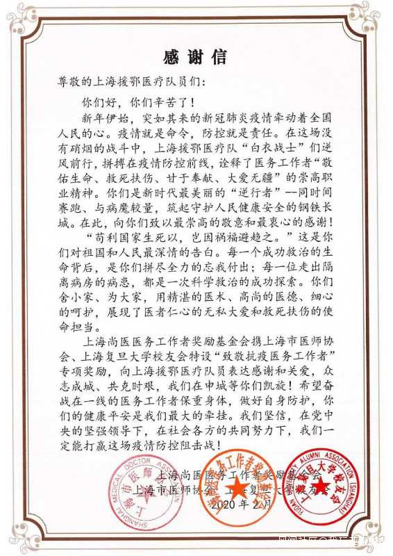 致敬奮戰在抗擊新冠肺炎疫情一線的上海援鄂醫療隊員,上海尚醫醫務工作者獎勵基金會聯合上海市醫師協會、上海復旦大學校友會、上海仁德基金會募集的人民幣1000萬元,全部用於獎勵赴鄂抗疫一線的醫務工作者,每人獎勵人民幣5000元(税後),已於近日由上海尚醫醫務工作者獎勵基金會直接匯入每位援鄂醫務工作者的賬户。上海尚醫醫務工作者獎勵基金會還聯合中國銀行上海分行為抗疫一線的醫務工作者們特設中銀·尚醫“守護天使”抗擊疫情專項保障項目,免費贈予每位援鄂醫務工作者,守護生命健康,為他們提供堅實保障。