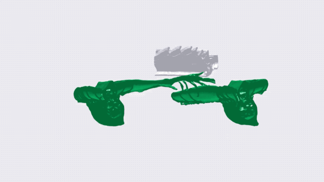 我猜,你會先將手肘彎曲,然後緩慢展開,讓手腕一起配合着上下襬動。鴿子的翅膀骨骼和你的雙臂正是同款運動。造鴿子的科學家分析了真·鴿子扇乎翅膀時每一幀的動作,發現**在翅膀骨骼主動運動的過程中,與骨骼相連的羽毛也會產生被動運動。**隨着翅膀逐漸伸展,羽毛間的夾角也會變大。