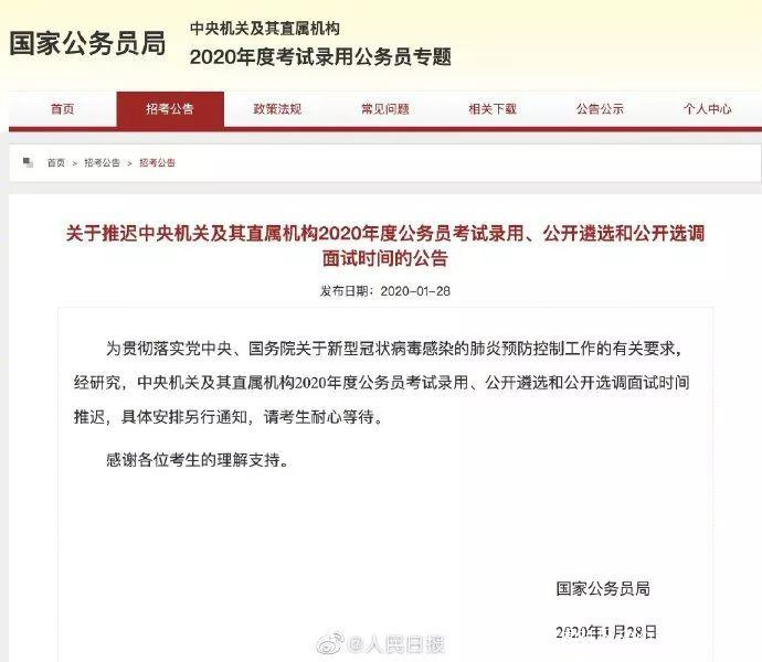 國家公務員局發佈公告稱,中央機關及其直屬機構2020年度公務員考試錄用、公開遴選和公開選調面試時間推遲,具體安排另行通知,請考生耐心等待。