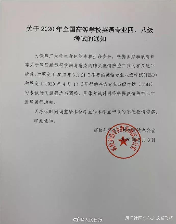 高校外語專業教學測試辦公室發佈通知稱,對原定於2020年3月21日舉行的英語專業八級考試(TEM8)和原定於2020年4月18日舉行的英語專業四級考試(TEM4)的考試時間進行適當調整,具體考試時間將根據疫情防控工作的開展另行通知。