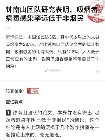 自新型冠狀病毒(2019-nCoV)肺炎疫情發生以來,各種荒唐“教導”滿天飛,比如“吸煙預防新冠感染”就是一例,這個打2003年SARS時就有過的“諄諄教誨”的變種謠言似乎也深得人心,頻頻出現在微信羣和朋友圈裏。有人甚至搬出了鍾南山院士的論文為其背書,稱“鍾南山團隊發表重磅論文,吸煙者感染率遠低於非煙民”、“煙油覆蓋在肺細胞表面相當於一層緊密的防護層,使得病毒無法附着和入侵人體細胞”,説得人民羣眾一愣一愣的。