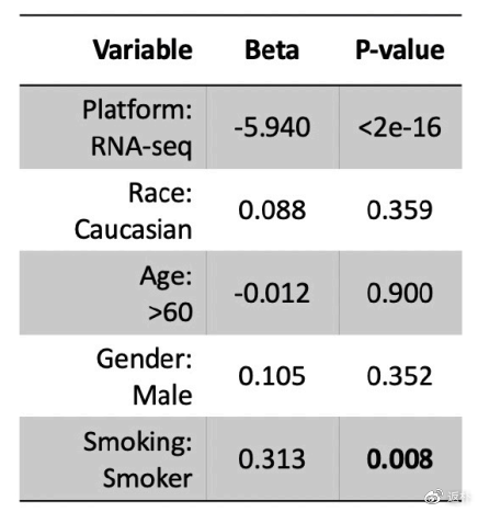 鑑於GSE19804 的RNA測序數據集主要包含來源於非吸煙女性的樣本,而TCGA數據集則既包括男性和女性,也包括吸煙者和非吸煙者的樣本,研究人員們認為這兩種數據集分析結果的差異可能是由吸煙史、性別以及其他因素而非種族因素導致的。因此,研究人員對多個獨立變量(年齡、性別、種族、吸煙狀態和數據平台)進行了多重線性迴歸分析,最終認為在不同種族羣體肺組織中ACE2基因的表達水平並無顯著差異。