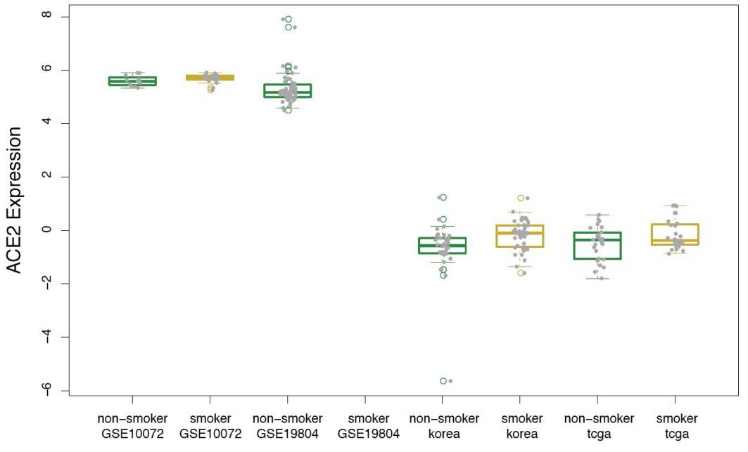 圖4. 比較三個數據集中吸煙人羣和非吸煙人羣肺組織上ACE2基因的表達水平[1]