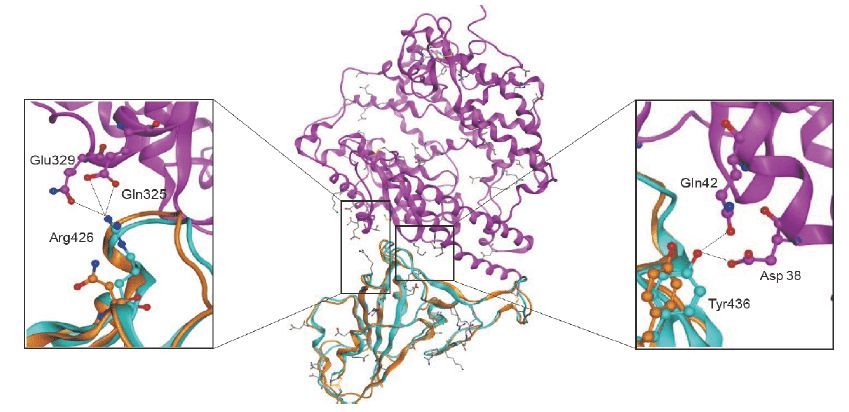 Xu X等人**[2****]通過計算機建模的方式模擬蛋白質分子間的相互作用,發現SARS-CoV的受體——血管緊張素轉化酶2(angiotensin-converting enzyme 2,ACE2)也是新型冠狀病毒的潛在入侵受體(圖2)。ACE2在人體的肺臟、消化道等部位均具有較高的表達水平。據此,研究人員從受體基因的表達水平出發,試圖通過比較在不同種族、年齡、性別和吸煙史**人羣中病毒受體基因ACE2的表達水平,以確定潛在的易感人羣,從而提供更好的預防和治療策略。