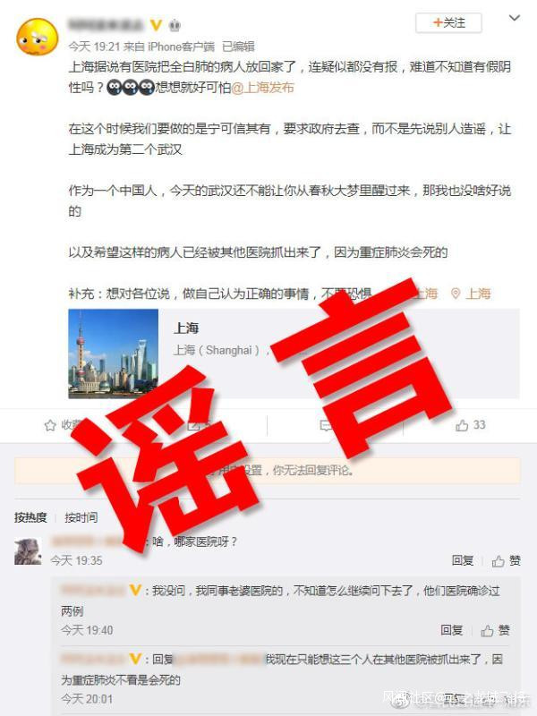 上海市公安局浦東分局官方微博@警民直通車-浦東 2月18日消息,17日,一則“上海據説有醫院把全白肺的病人放回家了,連疑似都沒有報”的微博帖文引發網友關注。經向上海市衞健委瞭解,上述信息不實。警方高度重視,第一時間找到發佈人陳某(女,37歲)。據調查:陳某承認自己將道聽途説的不實信息添油加醋後,在微博上發佈。目前,此事正在進一步調查中。