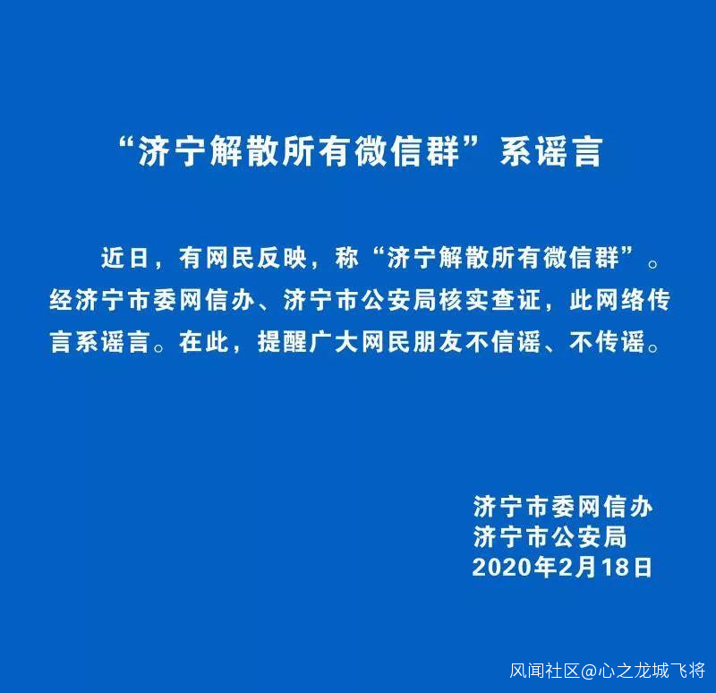 2月18日,濟寧市委網信辦、濟寧市公安局聯合發佈《“濟寧解散所有微信羣”系謠言》的聲明。聲明中提到: