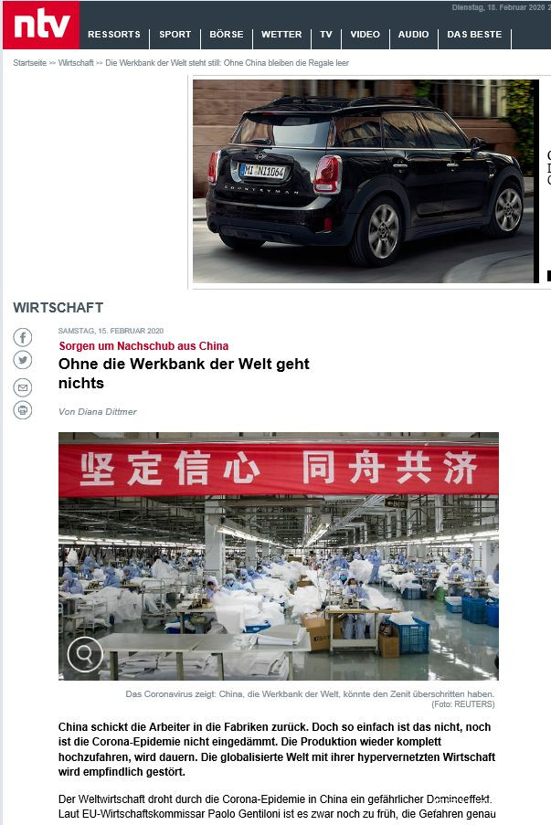 德國“n-tv”電視台報道援引歐盟經濟專員真蒂洛尼的觀點指出,要估算此次疫情對全球經濟的影響還為時尚早。但該台亦指出,在二十一世紀的當下,緊密相連的全球經濟面對疫情衝擊是如此脆弱,當中國這一“世界工作台”持續無法完全復產復工,則供應鏈就面臨斷裂,而全球其它國家的貨架顯然就要變得空空如也了。
