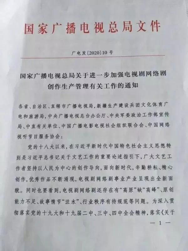 新浪娛樂訊 近日,國家廣播電視總局發佈了[2020]10號《關於進一步加強電視劇網絡劇創作生產管理有關工作的通知》。《通知》針對電視劇、網劇備案審查流程、電視劇“注水”、演員“天價片酬”等行業痼疾,推出了明確的新要求和新舉措。