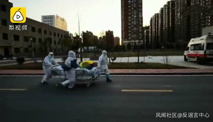 首先,視頻及傅蔚岡配圖中展示的是2月16日,發生在荊州洪湖市人民醫院的一幕,當時是醫護人員將危重症病人從感染科大樓轉移到ICU病房。