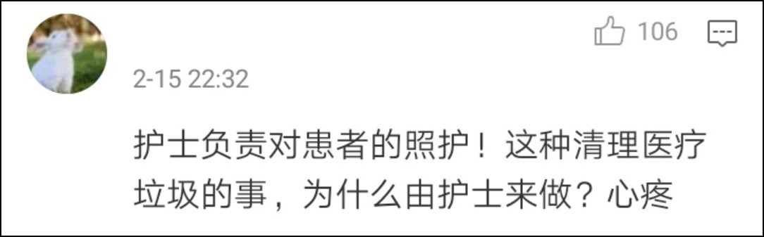 你們後勤保障做到哪裏去了?醫院本身就人手不夠,沒有清潔工,有沒有派一些志願者去幫忙呢?抗疫中每個護士都彌足珍貴,清運垃圾不需要技術,幹嘛浪費人手讓護士來做?而且是遠遠超出她負荷的工作量?