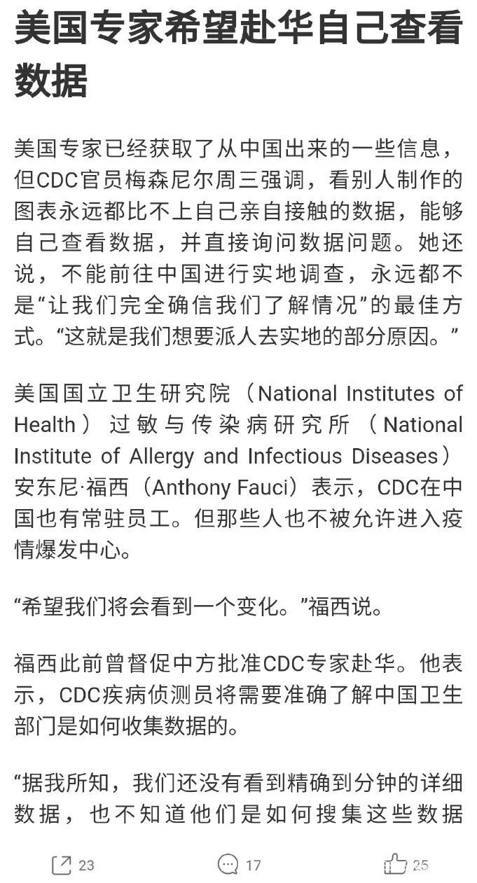 2月16日下午,這篇文章基本完成之後,我看到一則據CNN.ABC 報道,美國希望來中國的“專家”不是醫療專家,而是美國CDC官員,他們來中國不是幫助中國抗擊疫情,他們向中國提出的要求是必須讓他們現場核實檢查中國防疫情況,包括查看檔案和防疫計劃,包括統計流程以及所有的數據。
