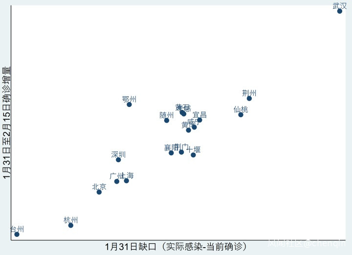 上圖選擇了幾個1月31日時確診數達到50名以上的重點城市,橫座標是根據「應有感染數-實際確診數」算出的缺口,縱座標是1月31日到2月15日的確診增量。兩者高度相關。