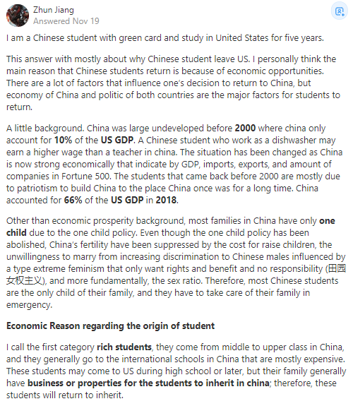 一些背景。2000年以前,中國是一個未開發的大國,中國僅佔美國GDP的10%。在美國洗碗的中國學生的收入可能比中國的教師還要高。隨着中國經濟的強勁發展,形勢已經發生了變化,這一點可以從GDP、進口、出口以及財富500強企業數量中看出。2000年以前回國的學生,大多是因為愛國主義,他們想把中國建設成為中國曾經的樣子。2018年,中國佔美國GDP的66%。