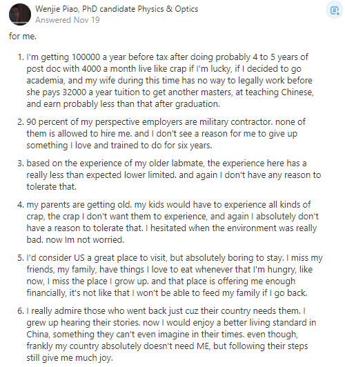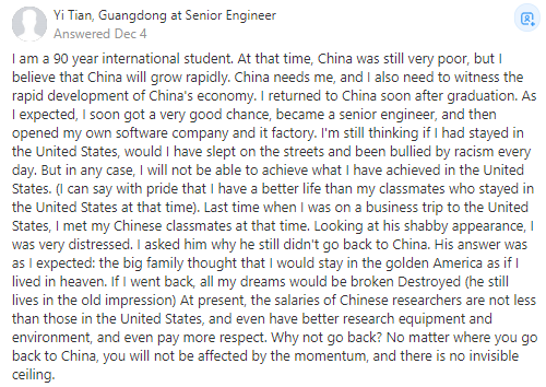 我是一個90年的國際學生。當時中國還很窮,但我相信中國會迅速發展。中國需要我,我也需要見證中國經濟的快速發展。我畢業後不久就回了中國。如我所料,我很快就有了一個很好的機會,成為一名高級工程師,然後開了自己的軟件公司和IT工廠。我一直在想,如果我留在美國,我會不會每天睡在大街上,被種族主義者欺負。但無論如何,我將無法實現現在取得的成就。(我可以自豪地説,我的生活比當時留在美國的同學要好)。上次我去美國出差的時候,我遇到了我的中國同學。看着他寒酸的樣子,我很難過。我問他為什麼還不回中國。他的回答和我預料的一樣:家族裏認為他會像住在天堂一樣呆在金色的美國。如果他回去,他所有的夢想都會破滅(他還活在老印象中)。目前,中國研究人員的工資不低於美國,甚至有更好的研究設備和環境,還能得到更多的尊重。為什麼不回去呢?無論你回到哪裏,你都會受到這種勢頭的影響,上升也沒有無形的天花板。