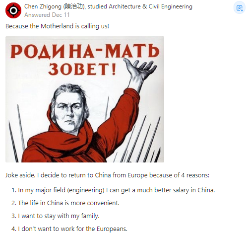 冒着聽起來有偏見的風險,我個人認為他們這一代人在中國長大,崇拜他們的政府和國家。他們的愛國主義和宗教一樣好。國家培育了他們,而XX主義在大多數國家並沒有得到廣泛的支持,在XX黨領導的社會主義ZF下,中國取得了巨大的進步,能夠給自己的公民帶來成熟的利益和回報。他們繳納賦税和社會保險,但他們得到的政府提供的服務和援助很值得。因此,一個人很自然地會覺得,如果他們學會了一兩項可能會讓他們的國家變得更好的技能,他們就有責任回來,這就是忠誠。