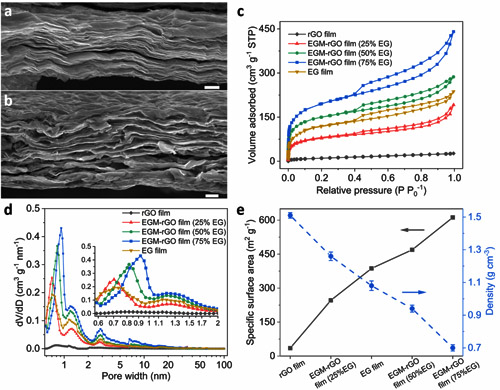 電化學電容器具有可快速充電、功率高、循環壽命長、工作温度範圍寬、安全性能高等優點,可用作大功率電源,在混合電動汽車、備用電源、便攜式電子設備等領域都具有廣闊的發展前景。然而電化學電容器相比於電池其能量密度較低,即單位體積內儲存的能量低,限制了其更廣泛的應用範圍,尤其是在便攜式智能設備中的應用, 需要進一步提高體積能量密度。近日,中國科學院金屬研究所與英國倫敦大學學院合作,在《自然-能源》(Nature Energy) 在線發表題為《可調層間距、高效孔利用石墨烯薄膜的電化學電容儲能研究》(Tuning the interlayer spacing of graphene laminate films for efficient pore-utilization towards compact capacitive energy storage)的研究論文。