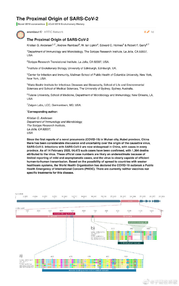 今天Scripps研究所的著名病毒進化學家Kristian Andersen在preprint的virological.org發表了文章反駁了新型冠狀病毒的“人工合成”陰謀論,眾多著名病毒學家如哥大教授Vincent Racaniello紛紛轉載並支持。這是目前最有技術含量的一篇反駁研究(O網頁鏈接 )。