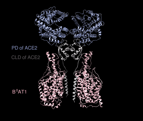 上面的藍色和灰白色部分,是ACE2的兩個結構PD(肽酶結構域,peptidase domains)和CLD(Collectrin樣域,Collectrin-like domain),但ACE2很難在體外穩定獲得,常常是與腸道內的一個氨基酸轉運蛋白B0AT1打包一同出現。