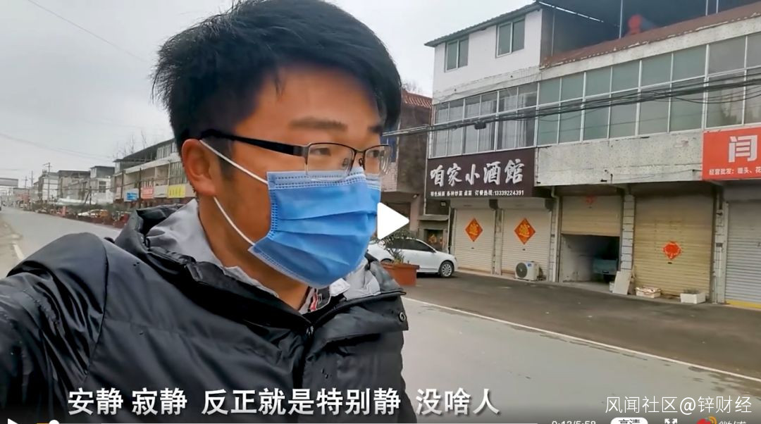 “現在我們這個街上是特別的清淨,安靜,寂靜。”大Sao舉着手機拍攝,他戴着口罩,只露出濃密的一字眉和那副粉絲熟悉的黑框眼鏡。他是趣頭條上的土味吃播作者,在全網各平台已有500萬粉絲。
