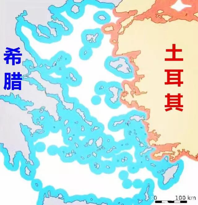 在希臘和土耳其,6海里領海是兩國原本的劃定。在這種劃分法則下,希臘擁有愛琴海的44%,土耳其擁有7%,其餘49%則是公海。但希臘一直想將領海範圍拓展到12海里,這樣的話公海區域只剩下了19%,這就意味着土耳其將基本喪失了自土耳其海峽往地中海方向的出海口。