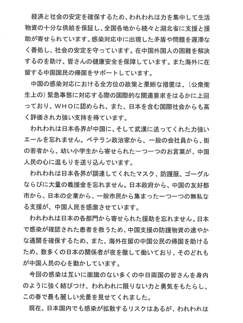 與疫情的鬥爭仍在持續,我們堅信在中國共產黨和中國政府的堅強領導下,依靠中國人民的不懈奮鬥,在包括日本人民在內的世界各國朋友們的鼎力協助和支持下,勝利的曙光就在前面!