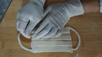 然後用牙籤戳出小孔,這樣一個「口罩」就捏完了: