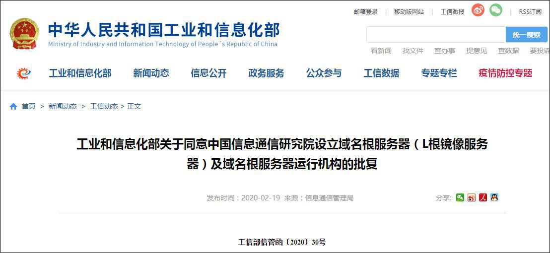 工信部發布關於同意中國信息通信研究院設立域名根服務器(L根鏡像服務器)及域名根服務器運行機構的批覆,同意中國信息通信研究院負責運行、維護和管理編號分別為JX0013L的域名根服務器。