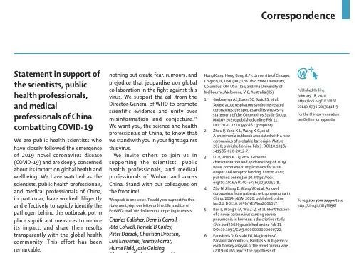 英國醫學期刊《柳葉刀》的網站19日發表多國學者聯合署名的聲明,強烈譴責那些認為新冠肺炎(COVID-19)並非自然起源的陰謀論,表達對奮戰在中國抗疫一線的科研、公共衞生和醫務領域工作者的支持。