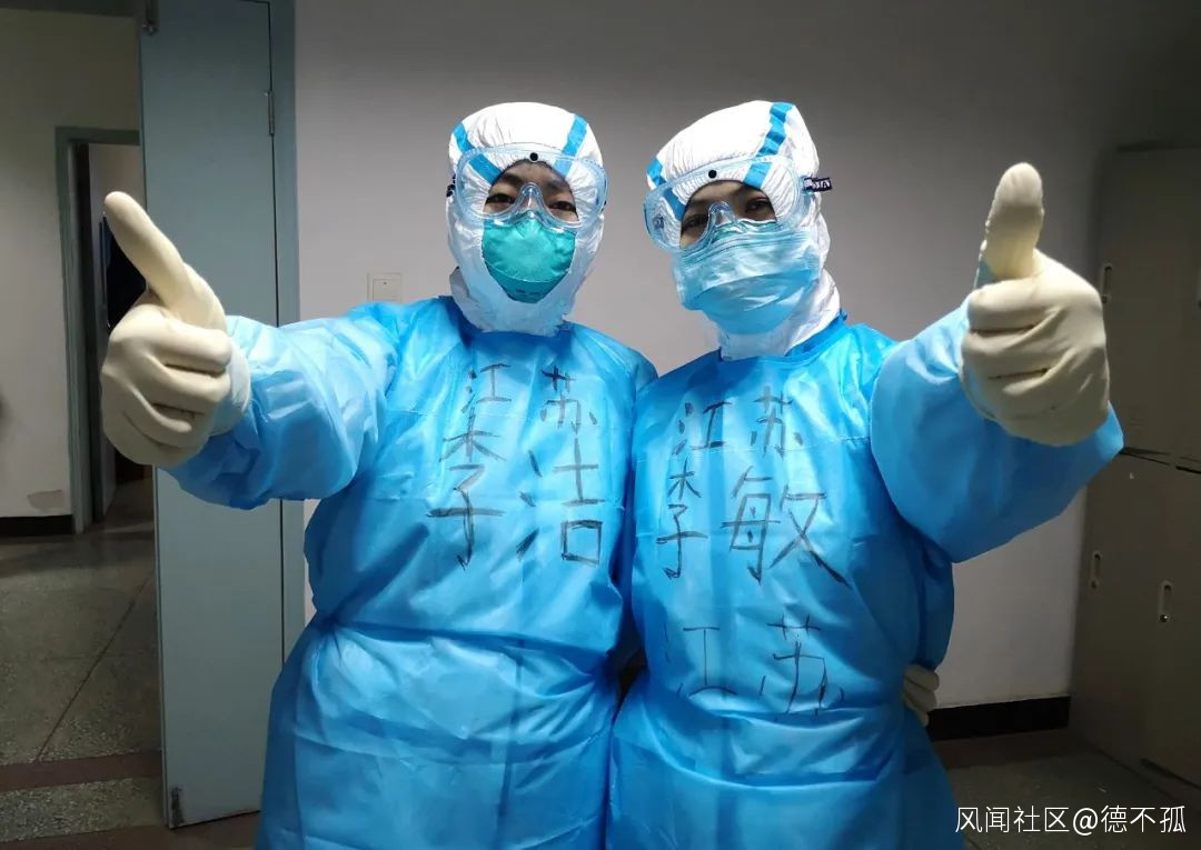 2月15日,在湖北黃石市中醫院的重症監護病房外,江蘇對口支援湖北黃石醫療隊隊員、江蘇省人民醫院的護士李潔(左)、李敏準備進入病區工作。新華社發