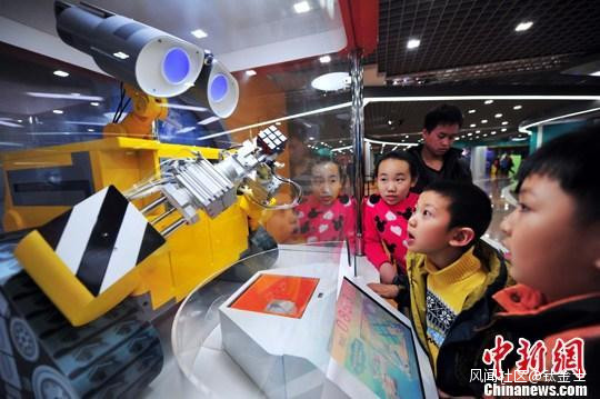 2月22日,瀋陽科學宮機器人與虛擬世界科普展開館,現場展示中國機器人及數字技術未來發展的全新概念演示,吸引了數百名小學生前來參觀體驗。圖為“解魔方機器人”吸引小學生前來參觀。