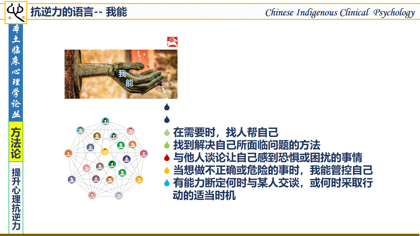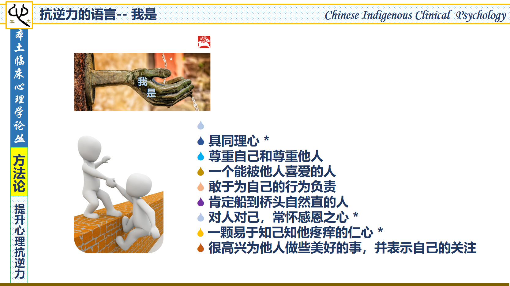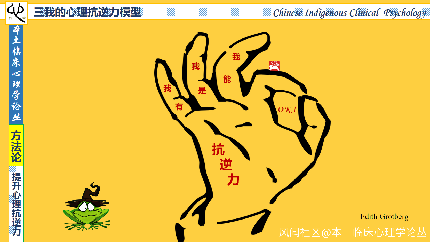 * 「具同理心」、「對人對己,常懷感恩之心」和「一顆易於知己知他疼癢的仁心」這三點,是筆者理解的中國文化歷來具有的抗逆力資源,這裏擴充了格特伯格「心理抗逆力三我資源模型」。