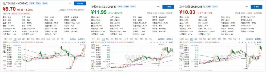 此次疫情中,除了提供課程內容的一線教育機構,以及賦能教育場景硬件的教育信息化公司,還有一個領域因為在線教育快速發展而迎來利好,那就是有線廣電行業。我們選取的另外三家公司,農曆新年後同樣迎來了股價大漲。