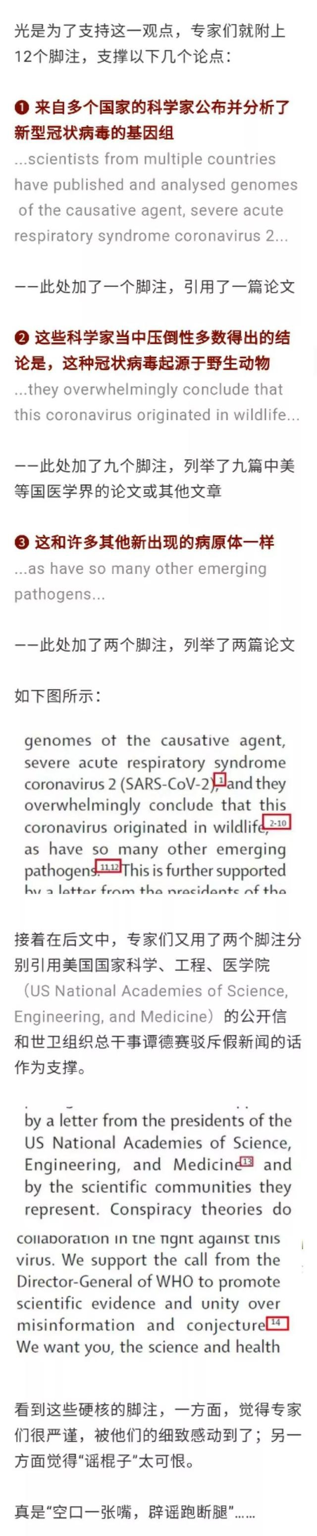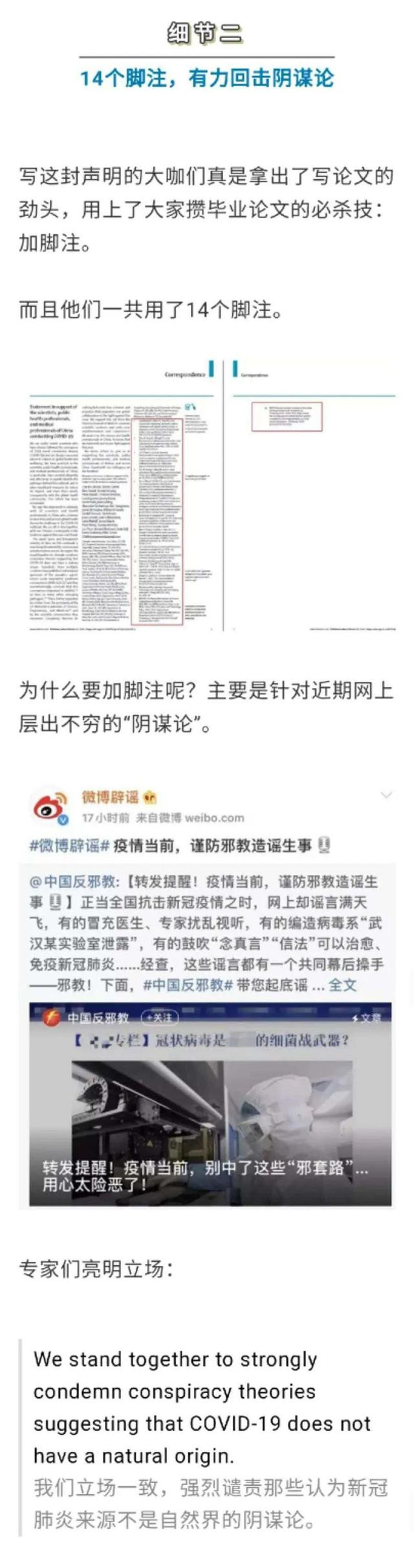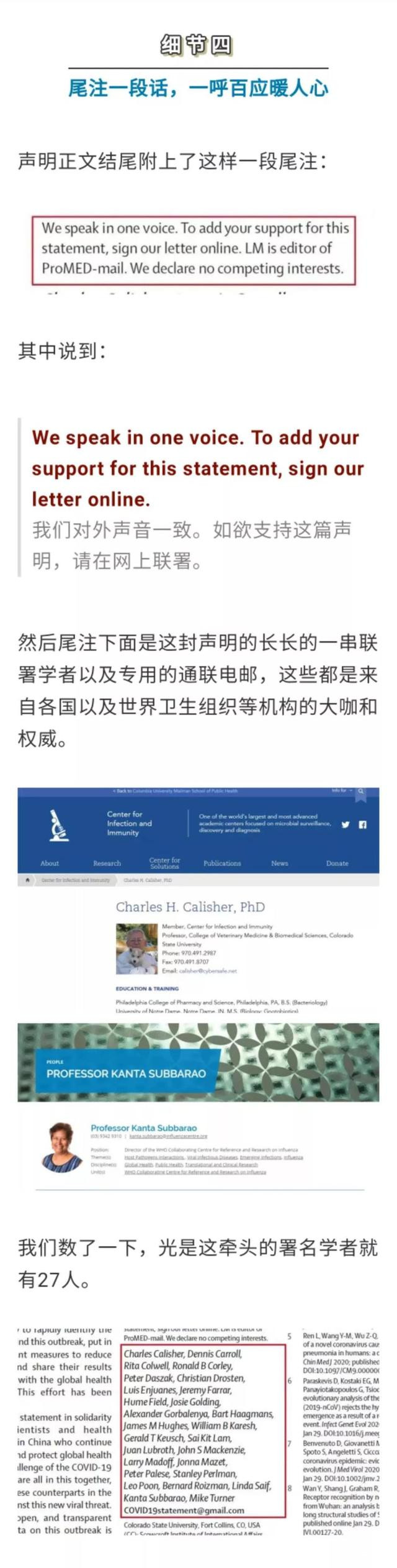 在這次疫情中相關數據迅速、公開且透明的共享如今正受到關於該疾病起源的謠言和錯誤信息的威脅。我們在此共同強烈譴責認為該新型冠狀病毒疾病COVID-19並非自然起源的陰謀論。來自世界各國的科研工作者已經對引發該疾病的病原SARS-CoV-2的全基因組進行了分析並公開發表了結果,這些結果壓倒性地證明了該冠狀病毒和其它很多新發病原一樣來源於野生動物。該科學結論也得到了來自美國國家科學、工程、醫學院院長及其所代表的科學界人士的支持。陰謀論除了製造恐慌、謠言、偏見、損害全球共同抗擊該疾病的工作外,別無它用。